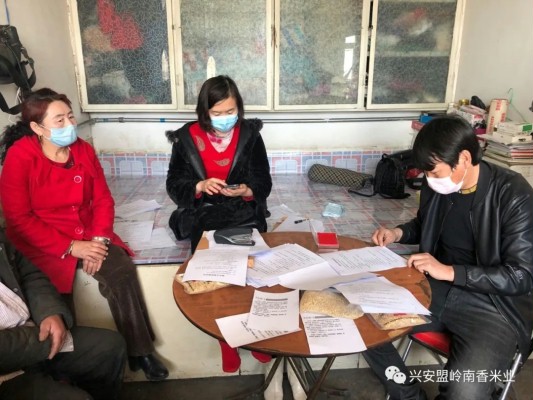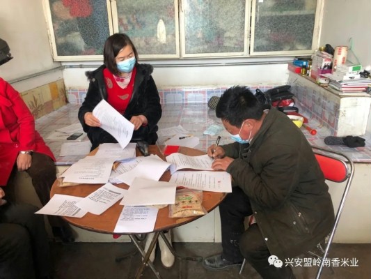 岭南香米业工作人员到乌兰哈达镇东苏嘎查村委会向当地农户介绍2020年春季订单水稻品种,与农户签订水稻种植订单。