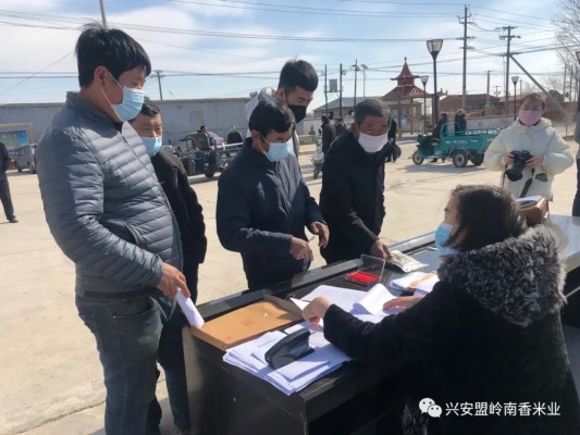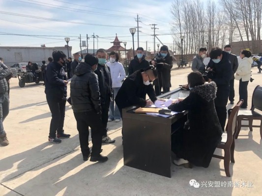 岭南香米业工作人员到乌兰哈达镇东苏嘎查村委会向当地农户介绍2020年春季订单水稻品种,与农户签订水稻种植订单。